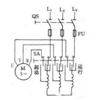 起動(dòng)時(shí),將轉(zhuǎn)換開(kāi)關(guān)SA擰到“啟動(dòng)”位置,此時(shí)電機(jī)定子繞組與自耦變壓器的低壓側(cè)連接,電動(dòng)機(jī)降壓?jiǎn)?dòng),待轉(zhuǎn)速上升到一定值時(shí),再將SA擰緊,電機(jī)定子繞組與自耦變壓器的低壓側(cè)連接,電機(jī)定子繞組啟動(dòng)。