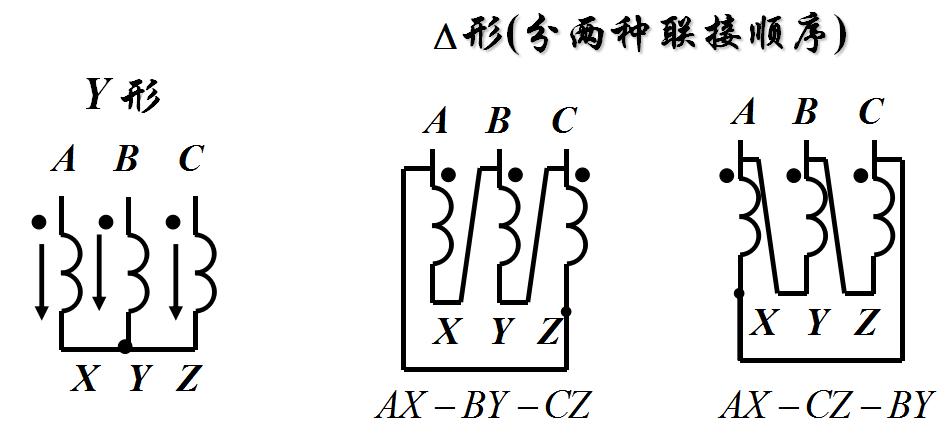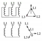 三相變壓器常用的繞組連接組有三角形、星形和曲折形。大寫字母Y、D、Z用于高壓繞組,中低壓繞組用同一字母的小寫形式Y、D、Z用YN(yn)或ZN(zn)用于中性點引出的星形或曲折連接。