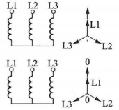 Dzn0連接組變壓器適用于以下場合:中性點可承受繞組額定電流;供電系統(tǒng)中諧波源大,高諧波電流突出;當單相不平衡負荷引起的中性線電流超過變壓器低壓繞組額定電流的25%時。繞組接線圖如下: